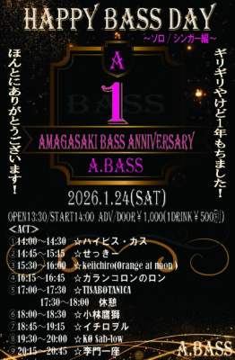 ≪Happy BassDay day1≫ 【日程】2026.1.10(土) 【会場】AMAGASAKI BASS(バース) 【時間】OPEN15:30/START16:00 【チケット】ADV¥2,500/DOOR¥2,500 (1Drink¥500別) 【ACT】 ☆STM ☆澪標 ☆THE PSYCHO’S ☆super scramble ☆ユーフラテス ☆Jang Voila ☆NEW ArT DUB